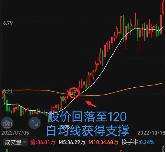 在上涨趋势中120日均线对个股有助涨作用,投资者通常将120日均线作为重要支撑线,当股价回落至120日均线附近时,将其视为买点。