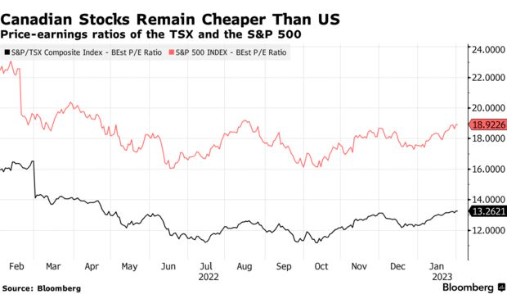 加拿大股市仍低于美国|TSX和标普500指数的市盈率。加拿大标普/TSX综合指数于1月份上涨1%,创1990年以来的第二好的年初开局。该加拿大市场基准股价于去年下跌7%,但年度波动涨幅仍超标普500指数10%,主要受益于能源、消费品和运输行业股的强劲表现。