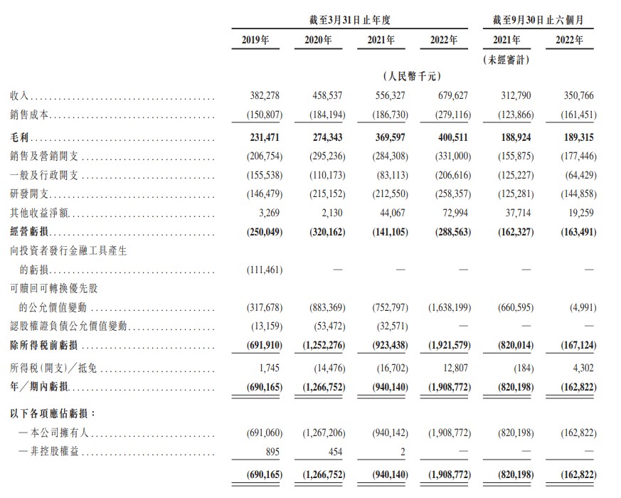 财务方面,2019年、2020年、2021年、2022年3月31日止财年,该公司实现收入分别约为人民币82亿元、59亿元、56亿元、80亿元;同期,毛利分别约为人民币31亿元、74亿元、70亿元、01亿元;净利润分别约为人民币-90亿元、-167亿元、-40亿元、-109亿元。