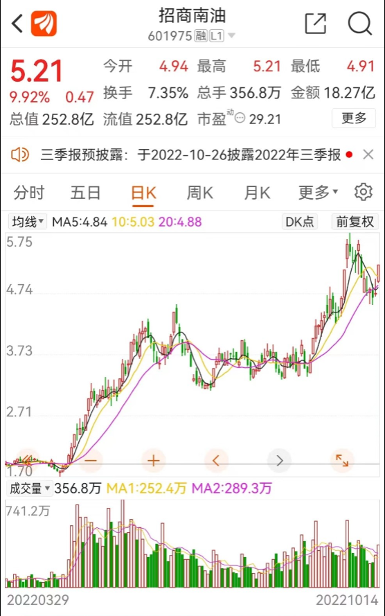 最近一个交易日,10月14日,招商南油股价再次迎来涨停,报收21元,总市值超250亿元。自今年4月股价见低点79元以来,股价涨幅已达191%。