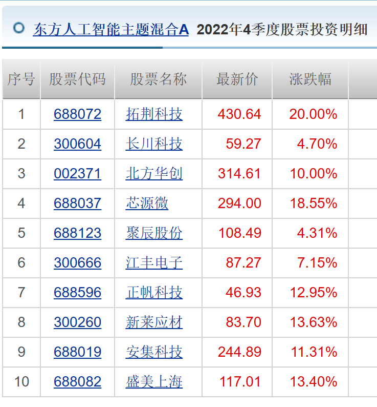 以东方人工智能主题A为例,去年四季度该基金的重仓股今天的涨幅情况如下:拓荆科技、北方华创双双涨停;芯源微、正帆科技、新莱应材、安集科技、盛美上海的涨幅也都超过10%。基金净值大涨并不在意料之外。