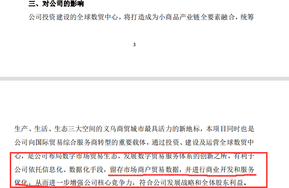 扩建以获得更多的出租收入只是其中一方面,这笔巨额投资更重要的部分,则是公司意识到了义乌小商品城的数据要素价值。在投资公告中,有一句话是非常重要的,即建设及运营全球数贸中心,是公司布局数字市场贸易生态,发展数字贸易服务体系的创新之所,有利于公司留存市场商户贸易数据,并进行商业开发和服务优化,从而进一步增强公司核心竞争力。