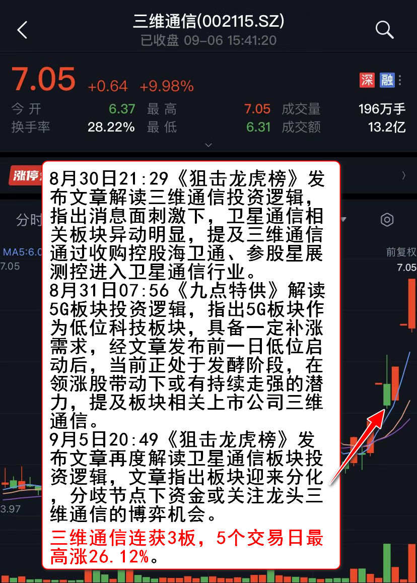 9月5日20:49《狙击龙虎榜》发布文章《轮动行情注意节奏把握》再度解读卫星通信板块投资逻辑,文章指出板块迎来分化,分歧节点下资金或关注龙头三维通信的博弈机会。