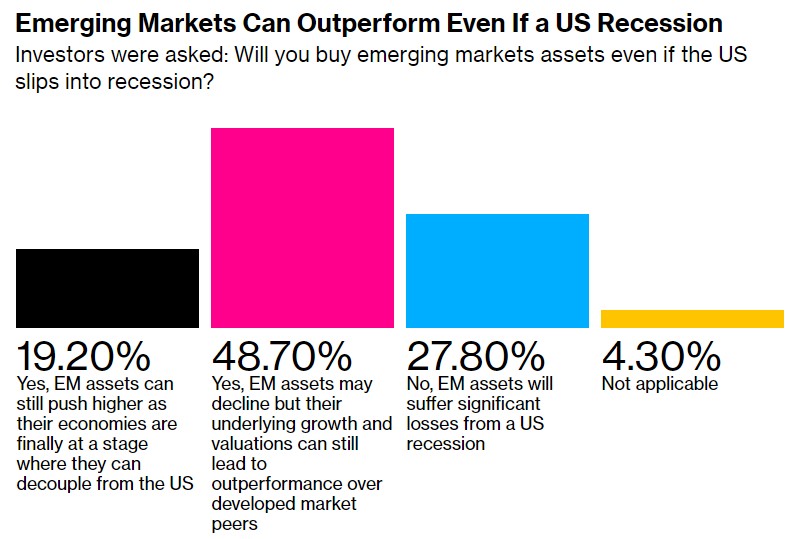 约49%的受访者表示,即使美国经济衰退导致新兴资产下跌,其潜在的增长和有吸引力的估值仍将帮助它们超越发达市场同行。